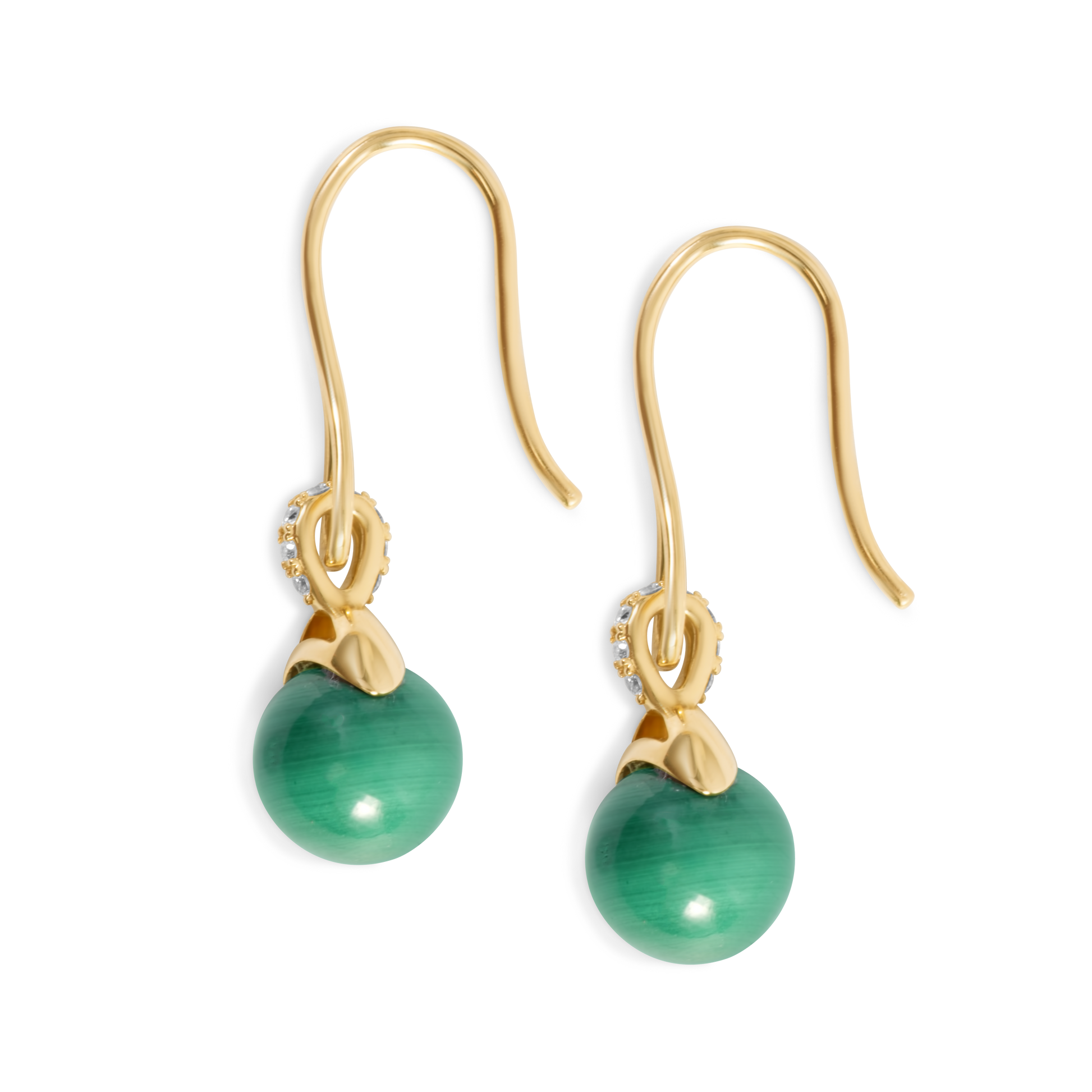 Known for its softness, rich green hue, and delicacy, no two pieces of malachite are alike. By polishing the gemstone into alluring spheres suspended by handcrafted and diamond-studded bands of gold, Bixler's has created a statement piece unlike any other.