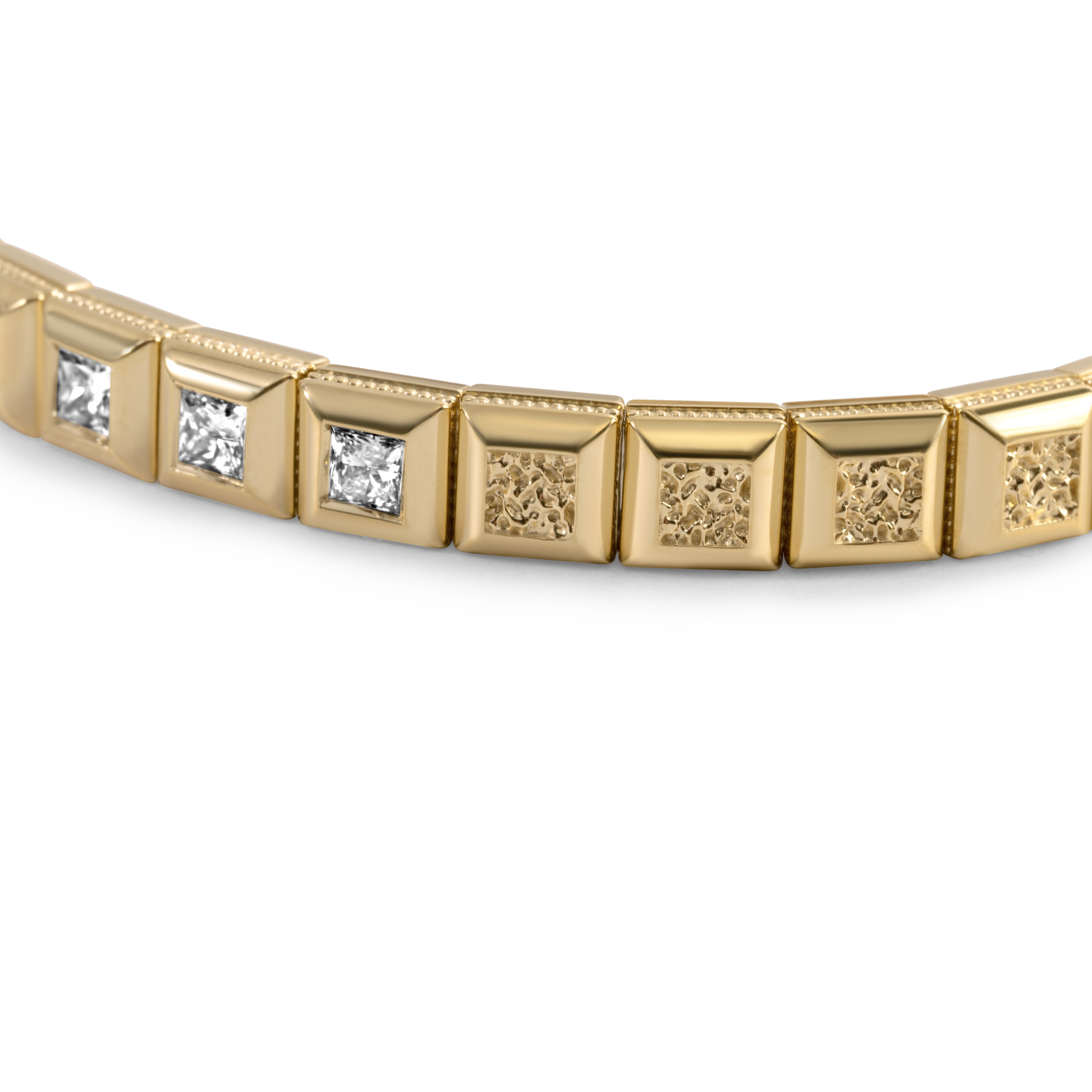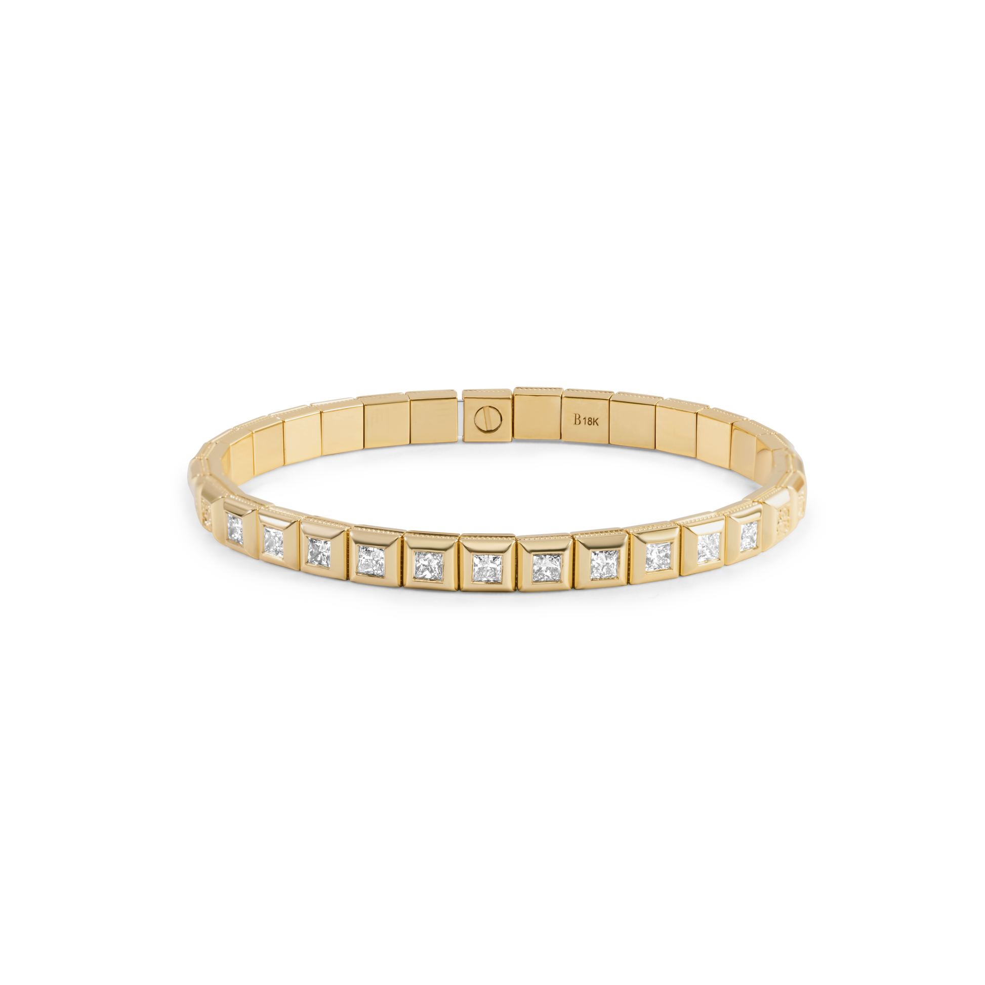Inspired by the multifaceted links found in fine Swiss timepiece bracelets, each square bezel can be added or removed to hold as many or as few gemstones as desired. While diamonds are the standard, the gemstones hand-set in each floating bezel can be swapped for any gemstone of your choosing.