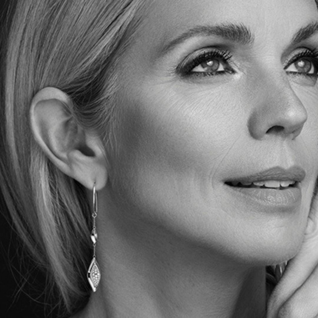 Using architectural principles of space and proportion, diamonds are hand-set upon floating layers of gold and platinum to refract light at a precise angle upon the sphere. Available as earrings and a necklace.
