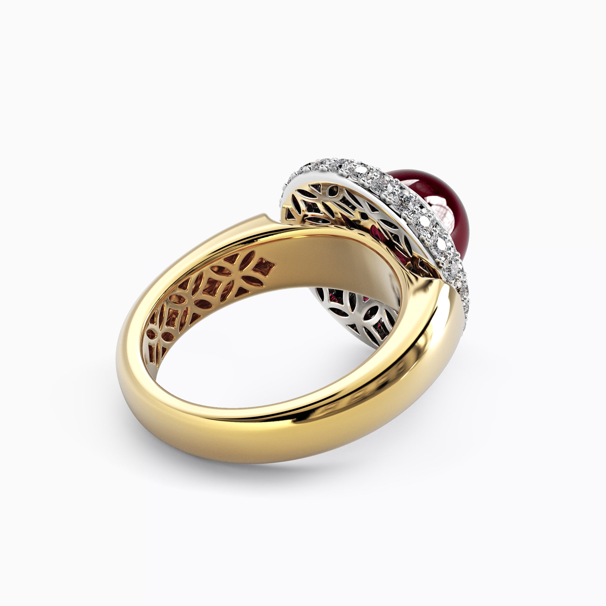 Inspired by the design principle of Color, a shimmering halo of crystalline diamonds creates the soft framing necessary to bring the deep hue of the gemstone to light. The band of gold is then polished by hand and under microscope to an above-flawless grade, further accentuating the richness of the colored gemstone.