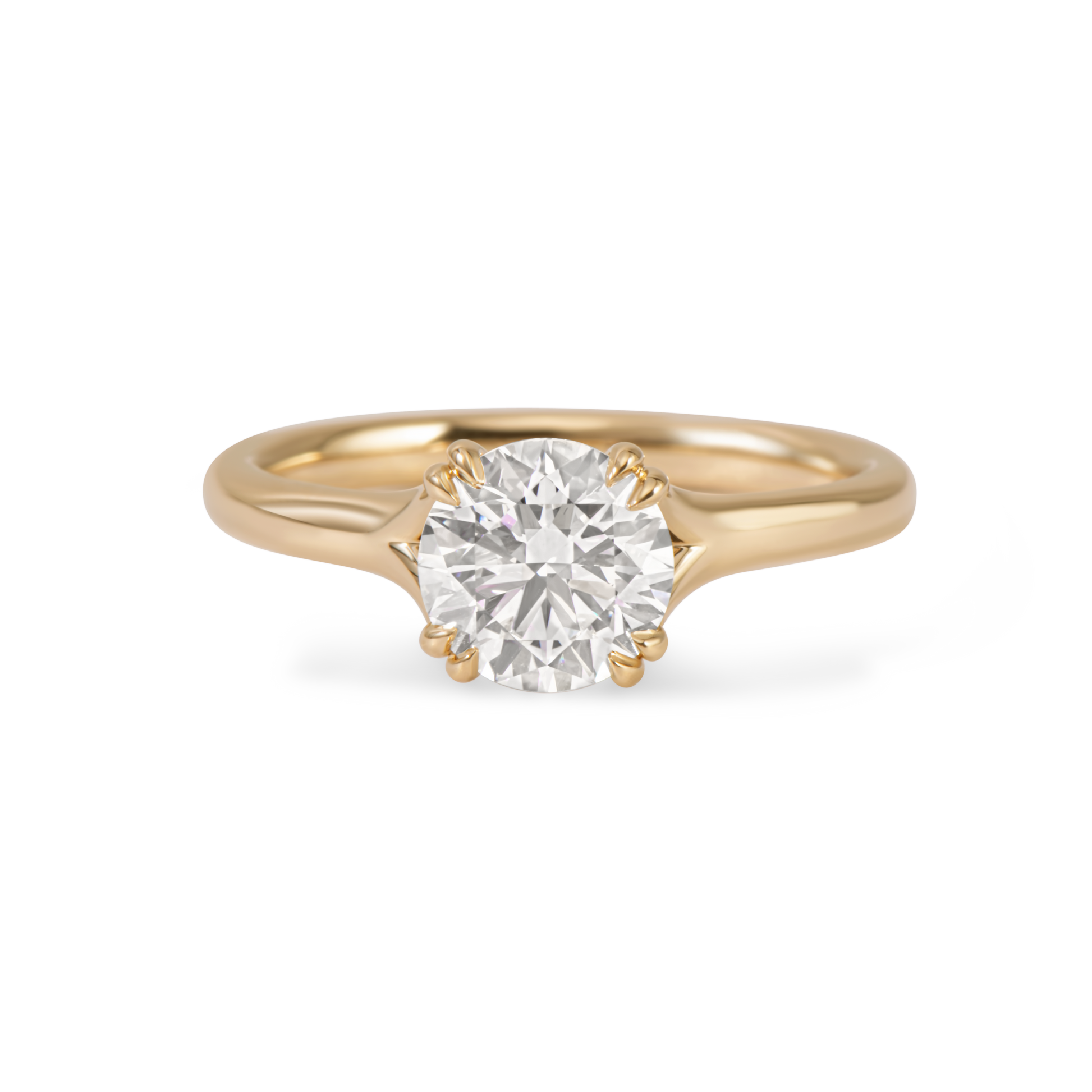 A classic with a signature twist, this solitaire engagement ring features striking architectural flourishes where the band meets the center stone. Sharp angles and sculptural lines elevate the traditional silhouette into something bold, modern, and artfully refined. Minimalism with intention.