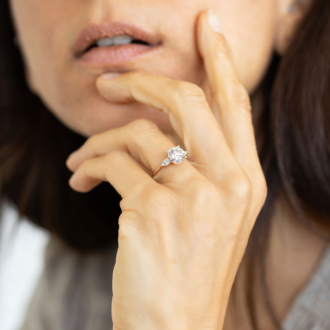 Striking the perfect balance between opulence and minimalism, Bixler's latest three-stone piece achieves the impossible with a luxurious offering of precious materials that remains understated and elegant in appearance. Experience all the iconic beauty of the solitaire engagement ring, with pear diamond accent stones offering enhanced visual effects of multi-faceted brilliance and sparkle, and an elongated shape that adds a slender and delicate profile to the hand.